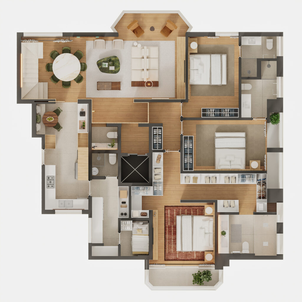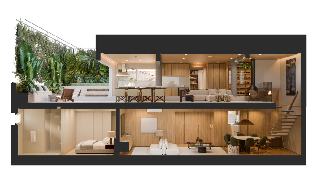 No piso inferior, o living espaçoso permite a criação de ambientes distintos, enquanto as três suítes se transformam em refúgios de conforto, com privacidade e requinte em cada detalhe.