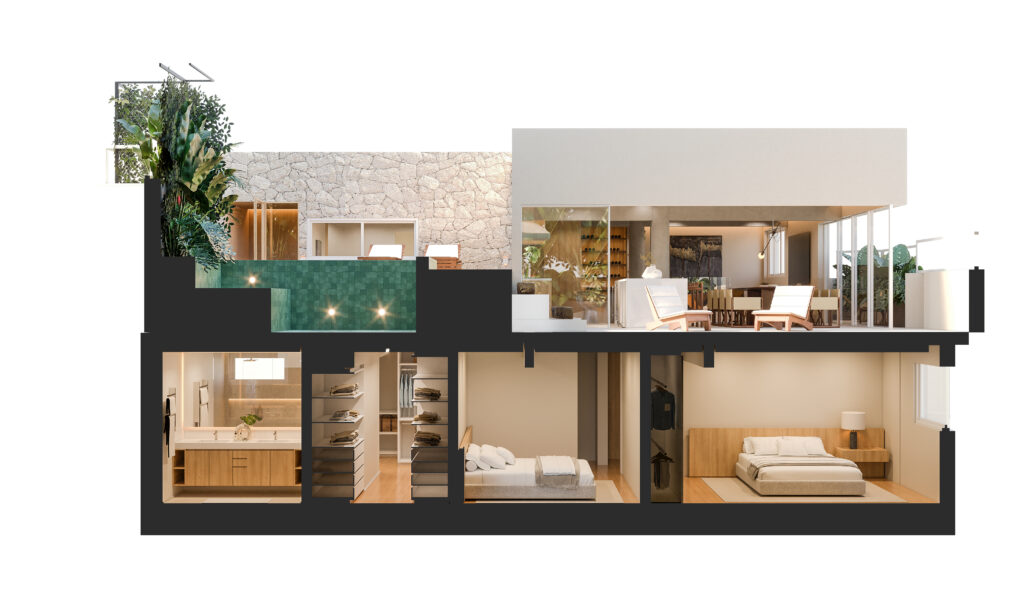 Os espaços se entrelaçam de forma fluida e harmoniosa, exaltando a luz natural e proporcionando versatilidade para criar diferentes atmosferas em qualquer ocasião.