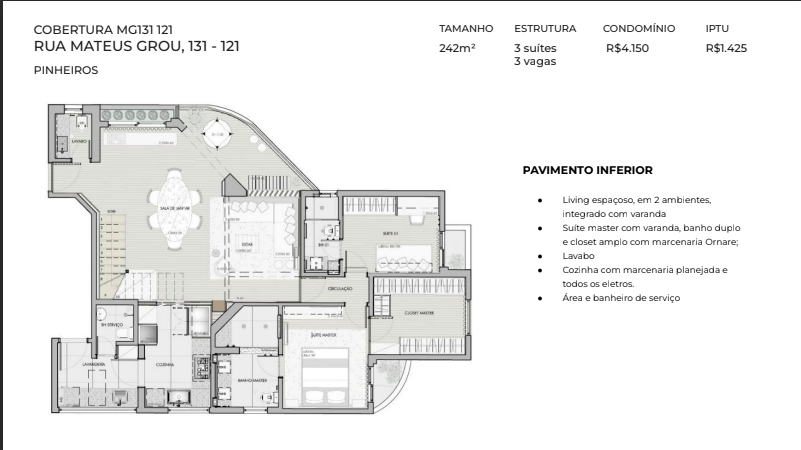 Localizada na cobiçada Rua Mateus Grou, esta cobertura duplex une o melhor da vida urbana à exclusividade de um projeto arquitetônico pensado para receber com estilo. Em uma das quadras mais desejadas de Pinheiros, o imóvel está a poucos passos da Rua dos Pinheiros, do supermercado Quitanda e de uma seleção impecável de bares, cafés e restaurantes.