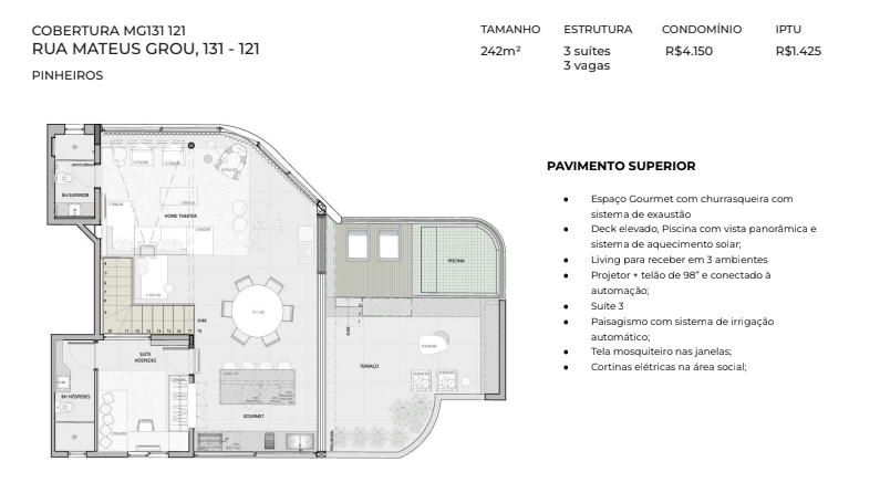 • Piso superior com gourmet completo, piscina com vista panorâmica, home theater com telão de 98”, paisagismo com irrigação automática e espaços perfeitos para receber
